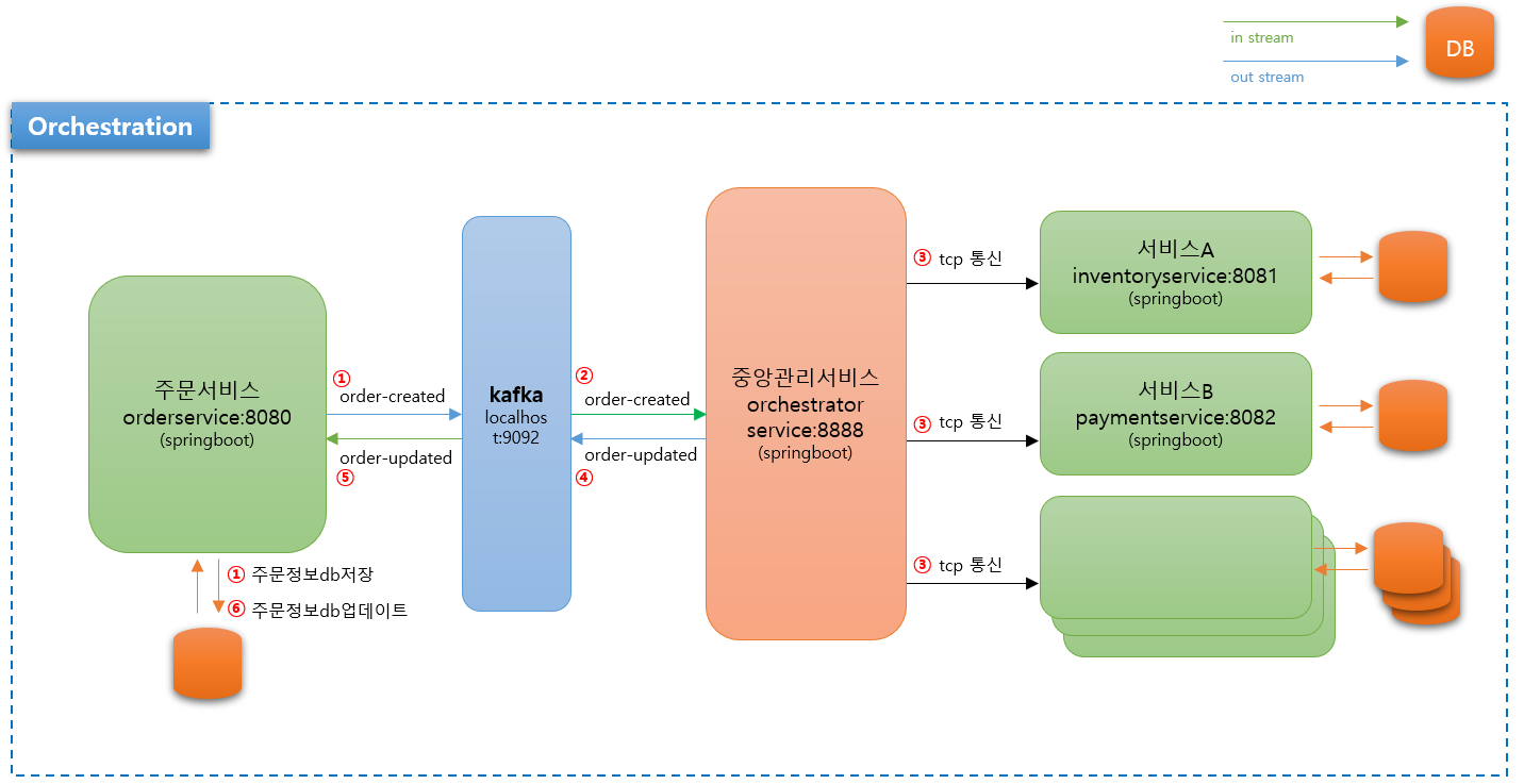 - Orchestration(오케스트레이션) : 중앙관리 별도 서비스(app)를 통해 2개의 event Queue를 사용하는 형태