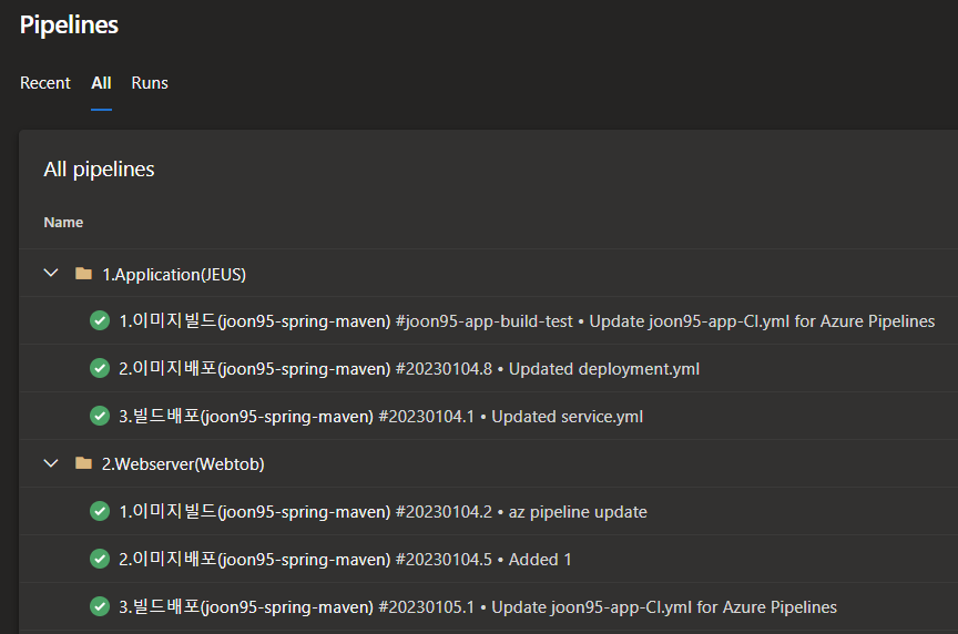 Azure Devops 에 접속하여 Pipeline>All 페이지에 들어오면 폴더별로 체크할 경우에 깔끔하다.
