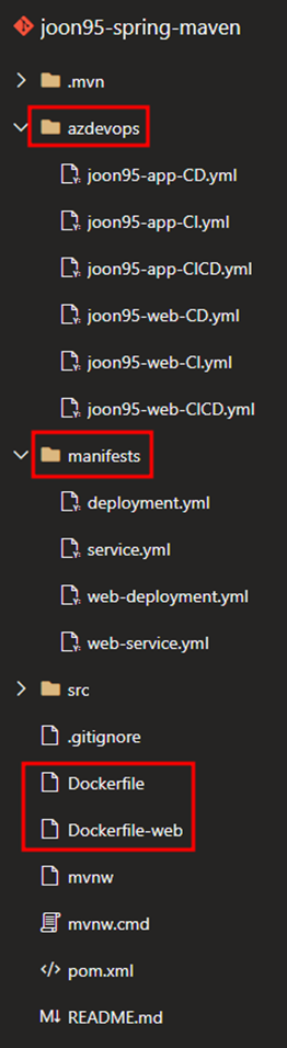 joon95-spring-maven 이라는 레포지토리에 application 소스코드를 업로드하여 사용하고 있고, 추가 파이프라인에서 사용될 폴더를 만들었다.