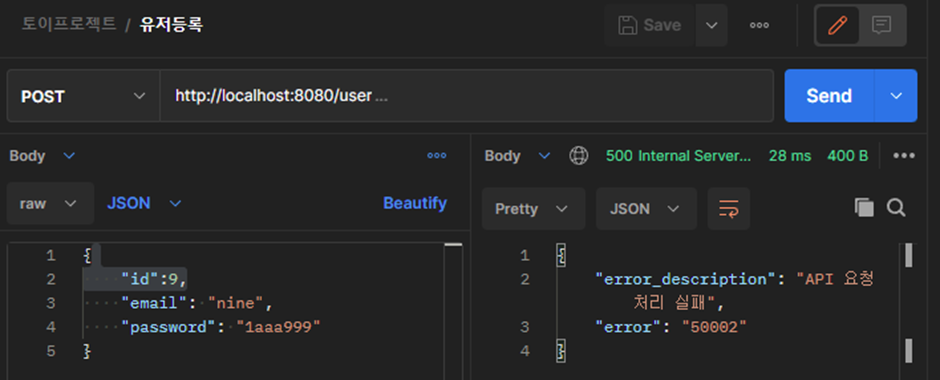 user를 등록하다가 exception이 발생하면 error를 캐치하게 됨