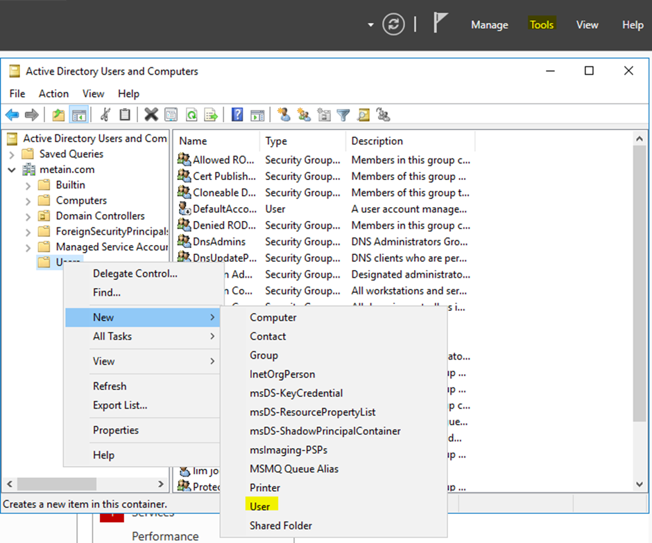 Server Manager > Tools > Active Directory Users and Computers