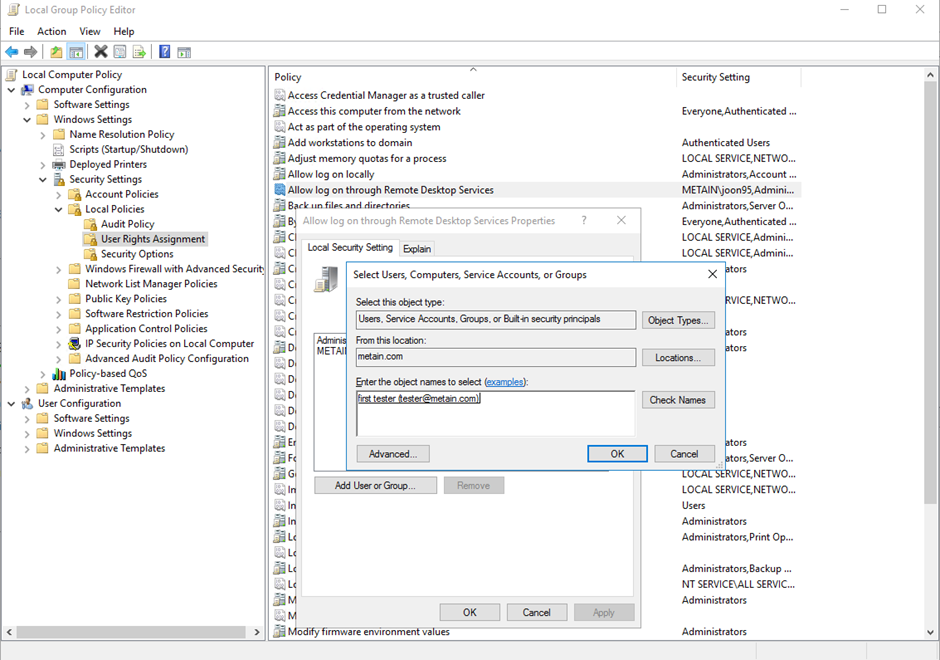 Windows Settings > Security Settings > Local Policies > User Rights Assignment > Allow log on through Remote Desktop Service > Add User or Group > 이메일 추가 > OK