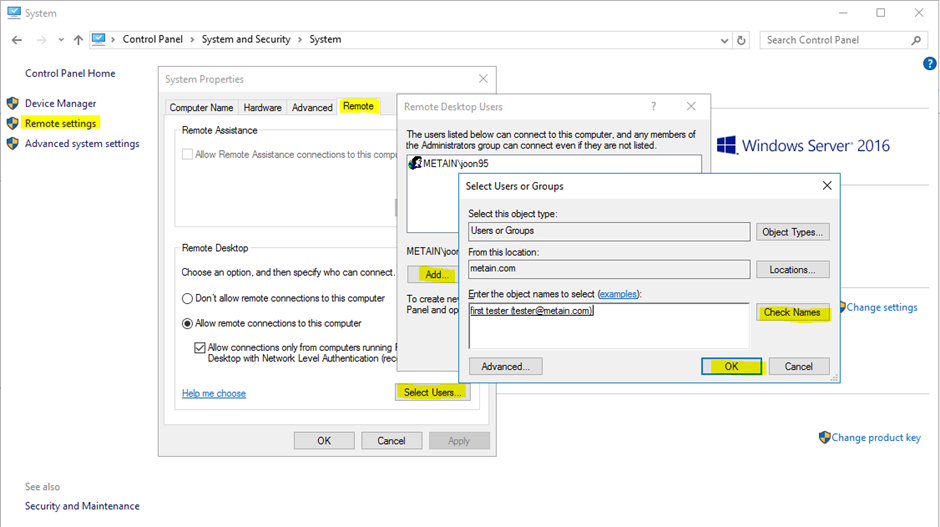 Remote settings > Remote > Select Users > Add > 사용자이메일 추가 > Check Names > OK