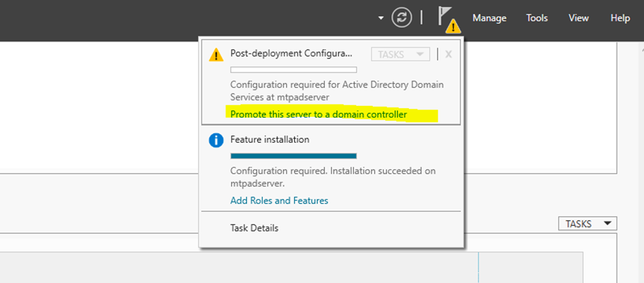 아래 Promote this server to a domain controller 버튼을 눌러 승격? 시켜야한다.