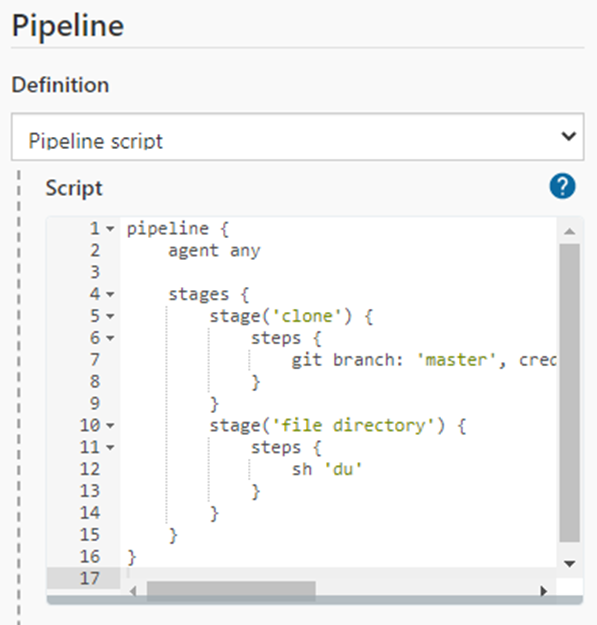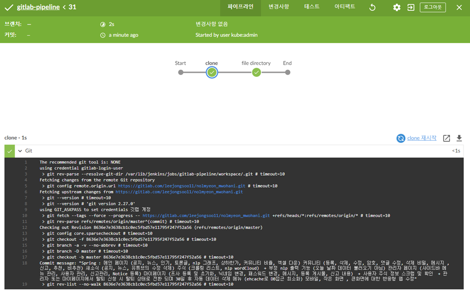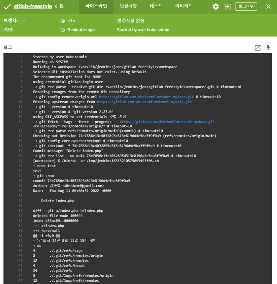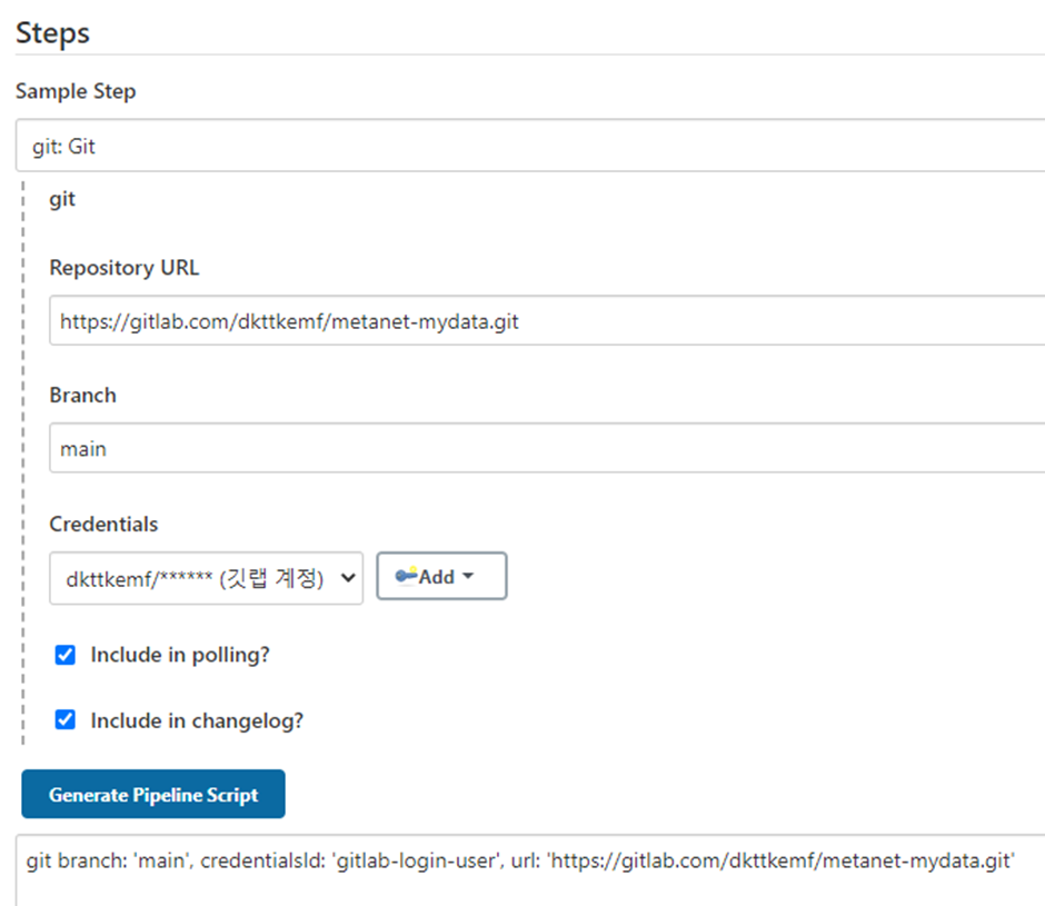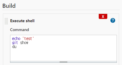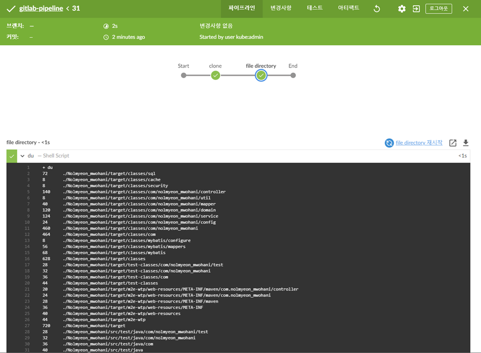 이제 다시 파이프라인으로 와서 git 접근 대상, du 명령어를 입력해주었다.