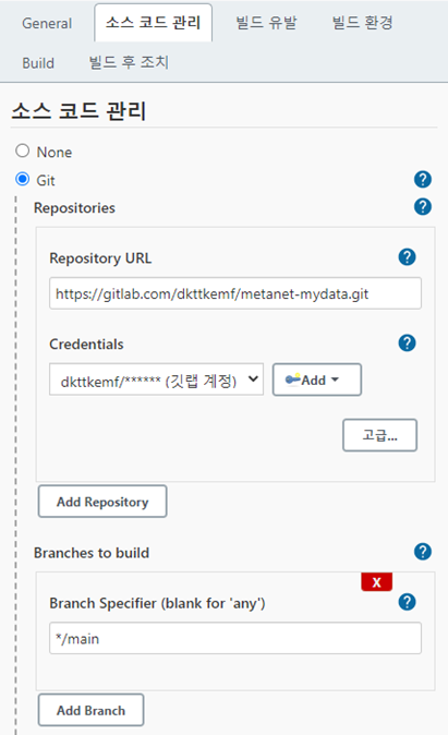 Credentials 항목에 계정/패스워드 정보를 기입한 뒤 만든 branch 명을 입력