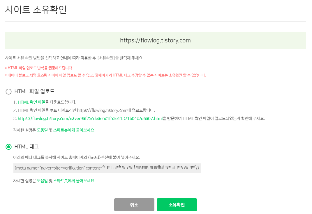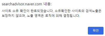 빨간 박스 버튼을 누르면 해당 사이트의 소유확인을 위한 창으로 가지는데