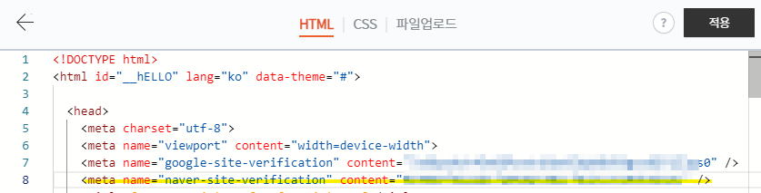 해당 태그를 복사한뒤 티스토리 스킨편집 > Html 편집 에 들어가 <head> 태그안에 붙여넣어준다.