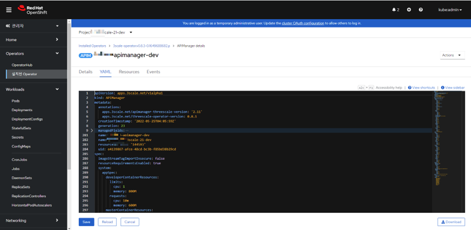 리소스 수정을 위해 3scale Operator > APIManager > YAML 로 이동한다.