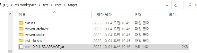 빌드가 되었으면, core 프로젝트의 target 폴더 안에 빌드가 완료된 .jar 파일이 생성된다.