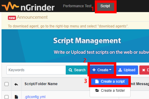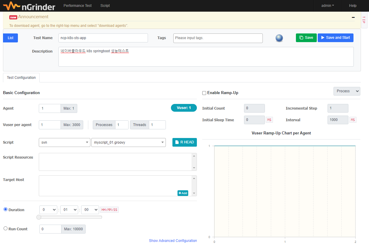 테스트이름, Agent 는 실제 기동중인 agent 대수 만큼만 선택가능, 작성한 script 선택.