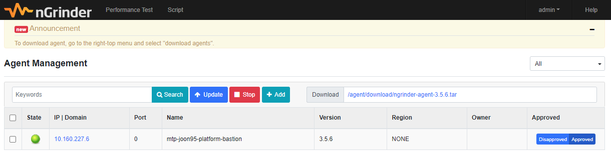 이제 우측상단>Agent Management 페이지로 들어가면 활성화된 agent가 목록에 뜬다.